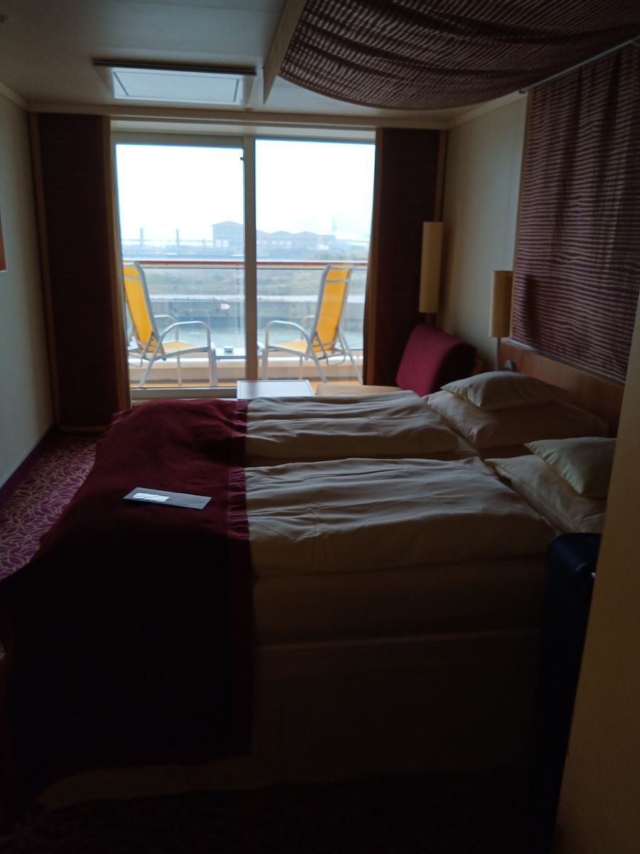 die nachts ihre Kabine nicht wiederfinden konnten. Alles bestens, schöne Kabine mit Glasbalkon, groß, hell, freundlich. Vorhänge zurückgezogen und vom Bett aus ganz früh morgens den Ausblick auf die Fjordlandschaft genießen, das hatte was.