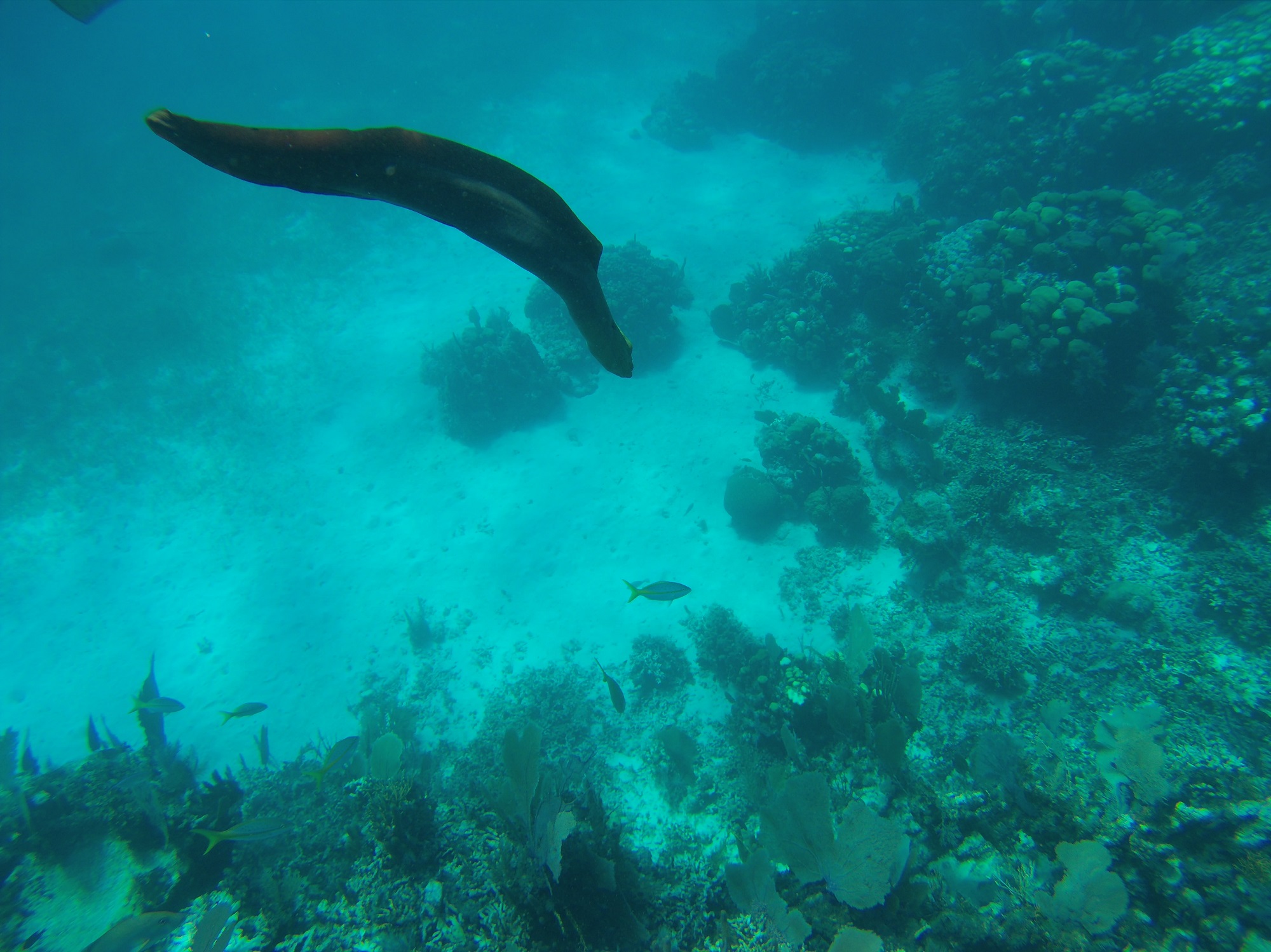 Beim ersten Schnorchel Stop eine Muräne war neugierig und schwimmt zurück ins Riff