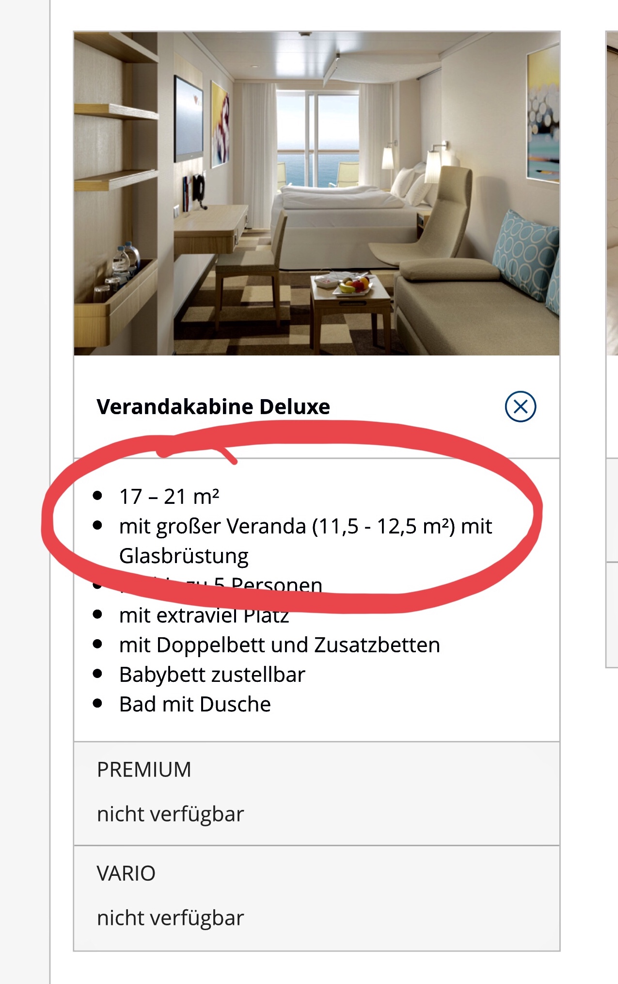 Aufgrund der Bewerbung der „großzügigen Sonnendecks“ durch die Reiseberaterin hatten wir uns dafür entschieden, explizit diese Kabinenkategorie im Vario zu buchen! Es kann nicht Aufgabe des Kunden sein, die Beschreibungen in der Buchungsmaske (oder durch die Reiseberaterin) auf Plausibilität zu prüfen.