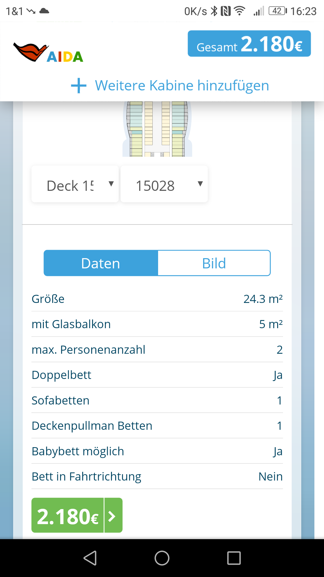 Ich finde die Zuteilung bzw. die mögliche Personenzahl bei Aida schon merkwürdig. Wir verreisen mit Tochter, Enkelkind (1,5 J), Lebensgefährte mit Sohn 9 J. Wir haben in Vario eine Veranda Komfort und eine Veranda Delux gebucht. Eigentlich wollten wir zwei Delux, geht aber nicht, da die nur für 3 Personen sind und das "Baby bzw. Kleinkind" als eine Person zählt. (Nova).