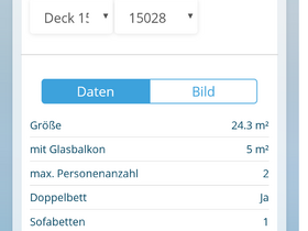 Die Größe des Innenraums ist uns gar nicht so wichtig, da wir nur zu zweit reisen. Ausschlaggebend für unsere Wahl dieser Kabinenkategorie war es, einen großzügigen Rückzugsbereich an der frischen Luft zu haben, dessen Größe in der Buchungsmaske exakt beschrieben wird.