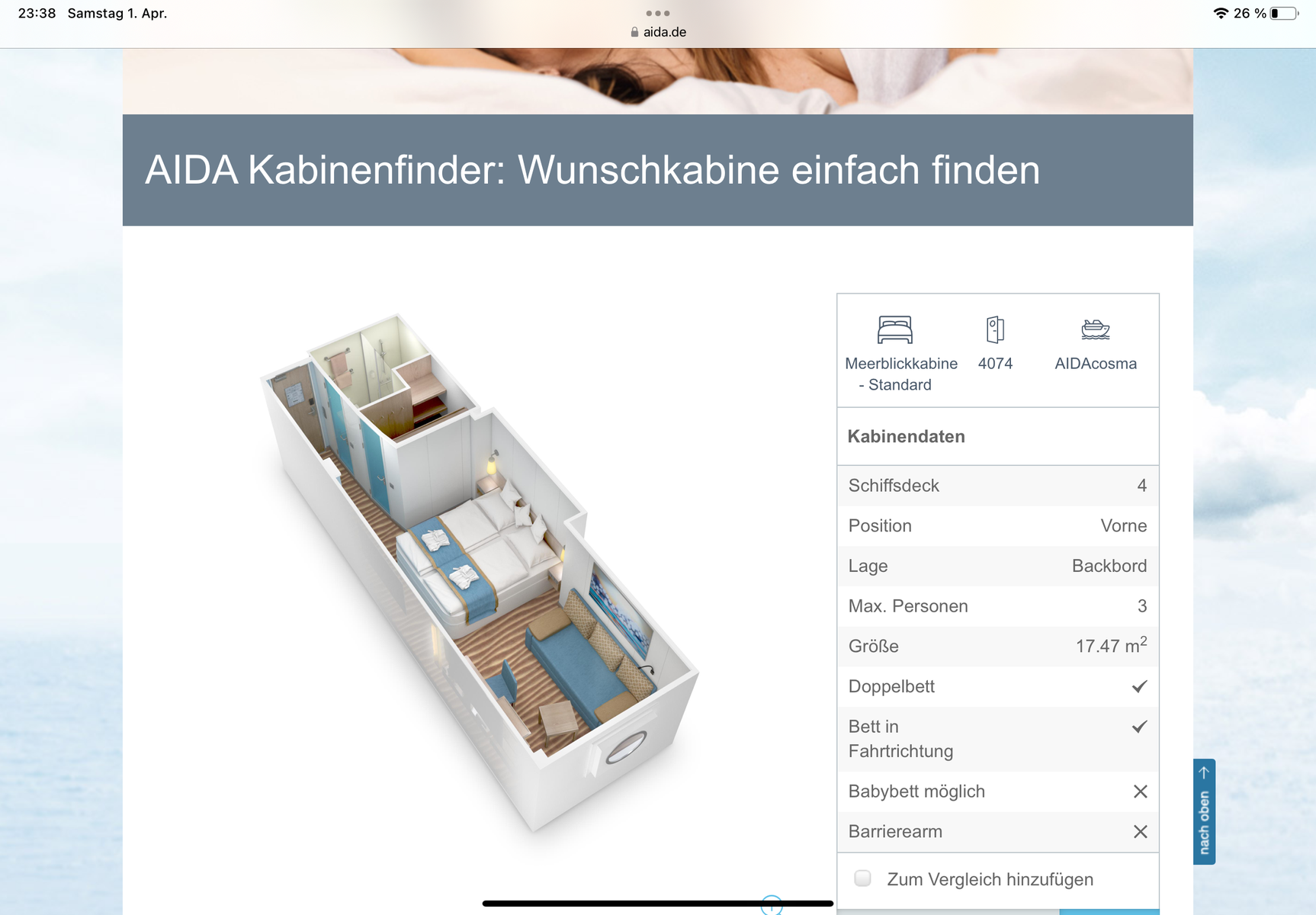 Ich beobachte mein eventuell Upgrade BK für bald startender Reise ( Screenshot freien Kabinen jeden Tag).