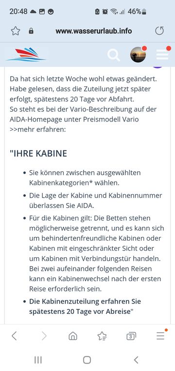 AIDA schreibt auf der Homepage: "Die Kabinenzuteilung erfahren Sie spätestens 20 Tage vor Abreise".