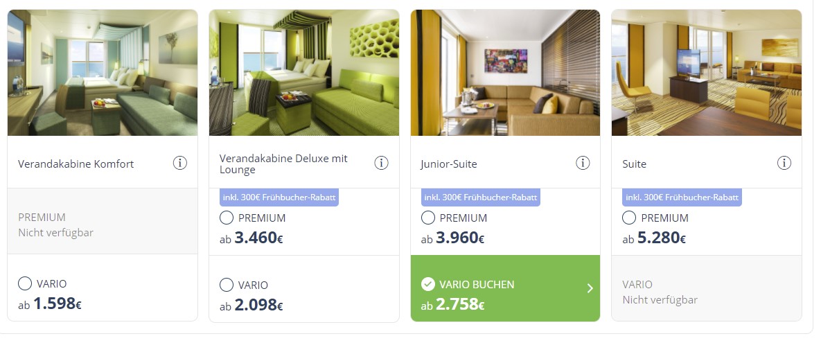 Dies ist übrigens bei TUI Cruises nicht anders. Der Pur-Tarif entspricht sozusagen dem Variotarif AI. Beim Pro Tarif kann man wie beim AIDA PREMIUM Tarif die Kabine inklusive Kategorie, also Balkon Kategorie A-G und die Kabine wählen. Beim PurTarif kannst du gar nichts wählen, weder Kategorie noch Kabinennummer, sondern nur die Art der Kabine, also Innen, Außen, Balkon oder ggf. Suite.