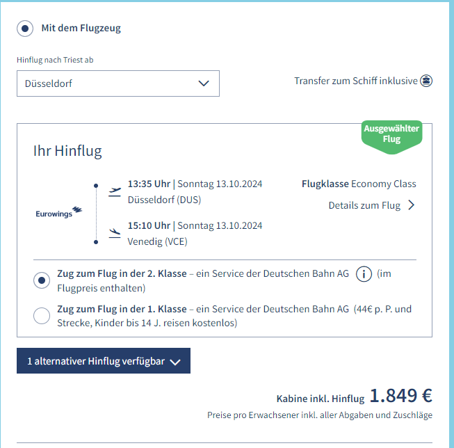 Das Anreisepaket nächsten Sommer in die Adria kostet bei TUI 1500 €. AIDA nimmt schon 1800 €. Der Hinflug ist Stand heute in Ordnung. Zurück gehts nur leider wieder so früh. :( Aber nach 14 Tagen nehmen wir es mal so hin.