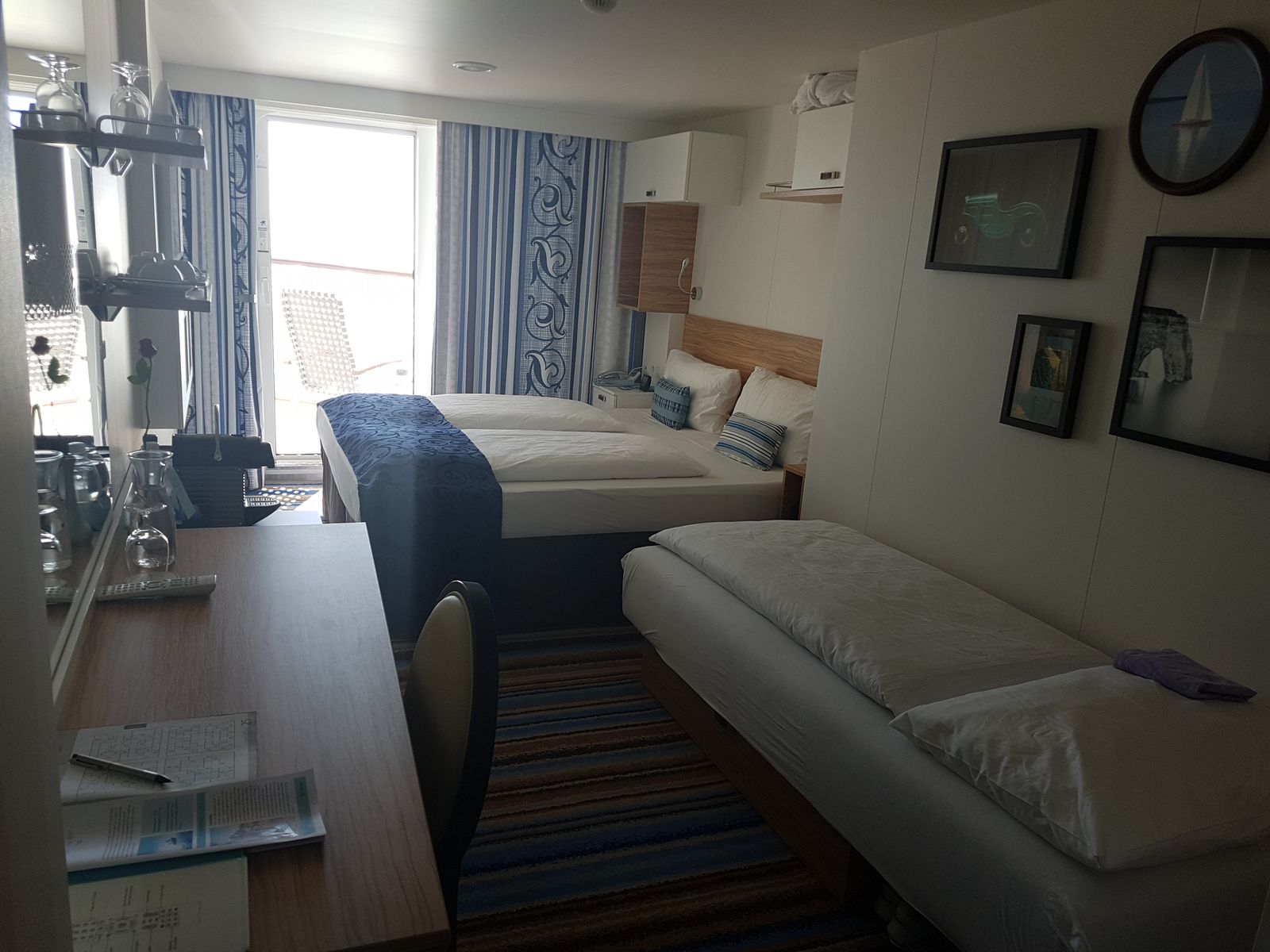 Die Kabine auf der MS2 war zwar nur eine normale Balkonkabine, diese hatte natürlich auch keinen begehbaren Kleiderschrank, fühlte sich aber trotzdem fast größer an. Ich denke es lag an der gefühlten Breite der Kabine.