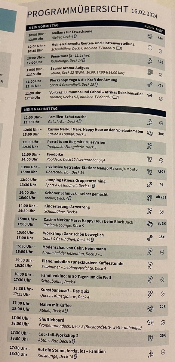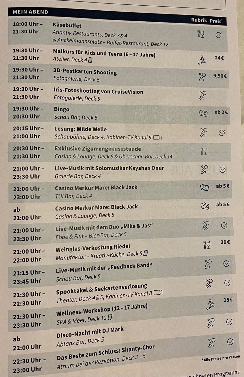 Um flexibel zu bleiben haben wir uns entschieden, nicht zu reservieren, auch nicht am ersten Tag an Bord und essen dann eben im Buffet oder Brauhaus. Was nicht schlimm ist, heißt aber eben einen Teil des Angebots nicht wahrnehmen zu können.