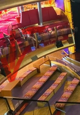 Keine gute Lösung fanden wir auf der Diva auf Deck 9 im Theatrium diese Holzblöcke die als Tisch dienen sollen. Eine Bank ist jeweils dahinter.