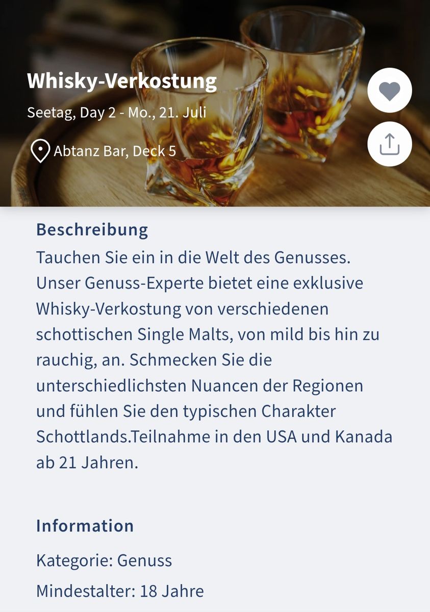 Aber mal ehrlich, bei Deinen "Anforderungen" bin ich wirklich nicht sicher, ob Du bei Mein Schiff glücklich wirst (von AI und den Genuss-Themen vielleicht abgesehen).
