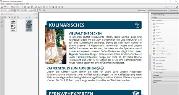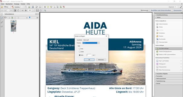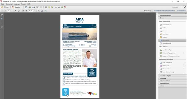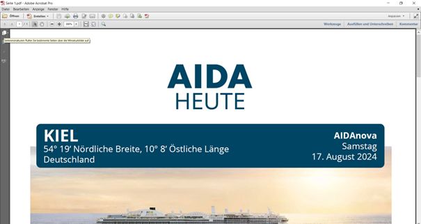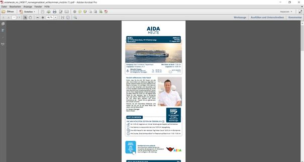 Wer schon mal versucht hat, im Nachhinein ein Exemplar der an Bord heruntergeladenen „AIDA heute“ zu Hause ausdrucken zu wollen, ist bisher daran gescheitert, denn diese „lange PDF-Schlange“ lässt sich leider nicht in einer lesbaren Form drucken, da alles klitzeklein auf einer Seite erscheint: