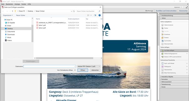 Anschließend aus dem rechts befindlichen Menü unter „Werkzeuge“ -> „Seiten einfügen“ -> „Aus Datei einfügen“ nunmehr „Seite 2“ auswählen und auf „Öffnen“ klicken: