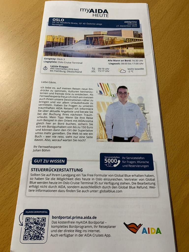 Aber in der aktuellen Kurzform, das Tagesprogramm, Einleitung, Hälfte Werbung für Spa und Shop und Infos zum Programm sind es 2 bis 3 Sätze dazu. Mehr ist es doch nicht? Das ganz alte was wohl viel ausführlicher sein sollte, laut Erzählungen von Menschen die schon vor hunderten Jahren auf See gefahren sind, gibt es doch schon lange nicht mehr. Da könnte man mir einer echten digitalen Ausgabe wieder viel viel viel mehr mit rausholen.