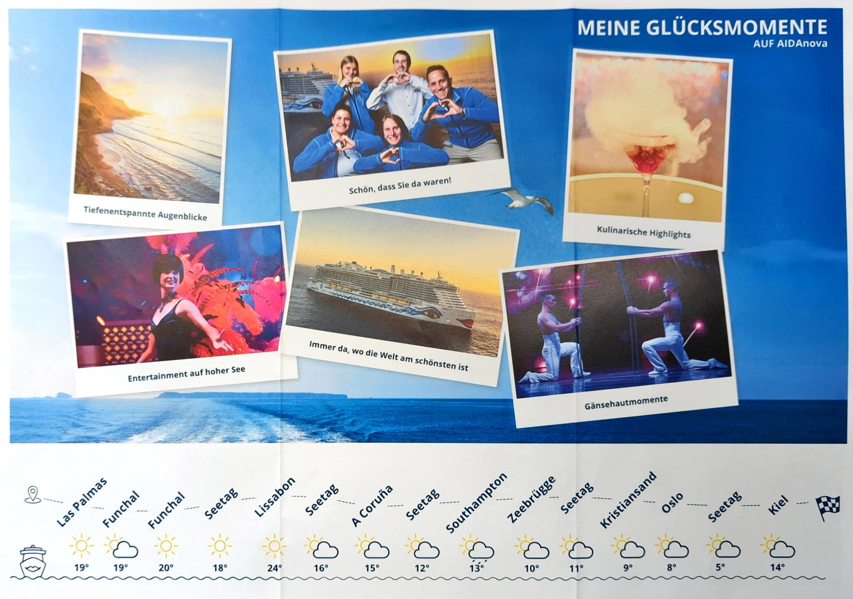 Im Juli hatte ich so eine Darstellung auf der Rückseite der "Abreise AIDA-heute" auf der Diva. Das Ganze lief unter "Meine Glücksmomente auf AIDAdiva", versehen mit Fotos verschiedener Destinationen und Events an Bord. Darunter eine Art Zeitstrahl, wo nochmals die einzelnen Häfen aufgeführt waren, versehen mit kleinen Symbolen zum jeweiligen Wetter. Das fand ich sehr schön.