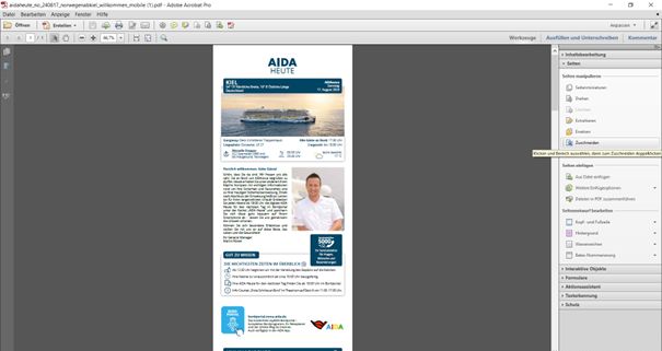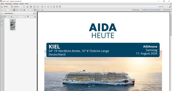 Wer schon mal versucht hat, im Nachhinein ein Exemplar der an Bord heruntergeladenen „AIDA heute“ zu Hause ausdrucken zu wollen, ist bisher daran gescheitert, denn diese „lange PDF-Schlange“ lässt sich leider nicht in einer lesbaren Form drucken, da alles klitzeklein auf einer Seite erscheint:
