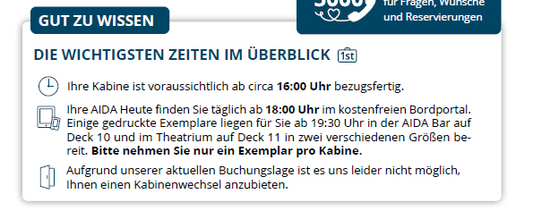 Das steht übrigens in der ersten AIDAheute, die beim Check-in verteilt wird.