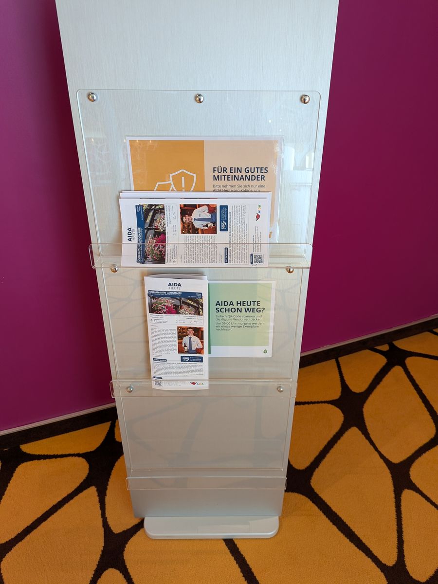 Da ich die AIDA Heute auch auf Papier bevorzuge, war ich vor der Reise gespannt bis skeptisch, wie das funktionieren wird. Es war aber an jedem Tag problemlos ein Exemplar zu erhalten, auch wenn man nach 20:00 Uhr an den Aufstellern war.