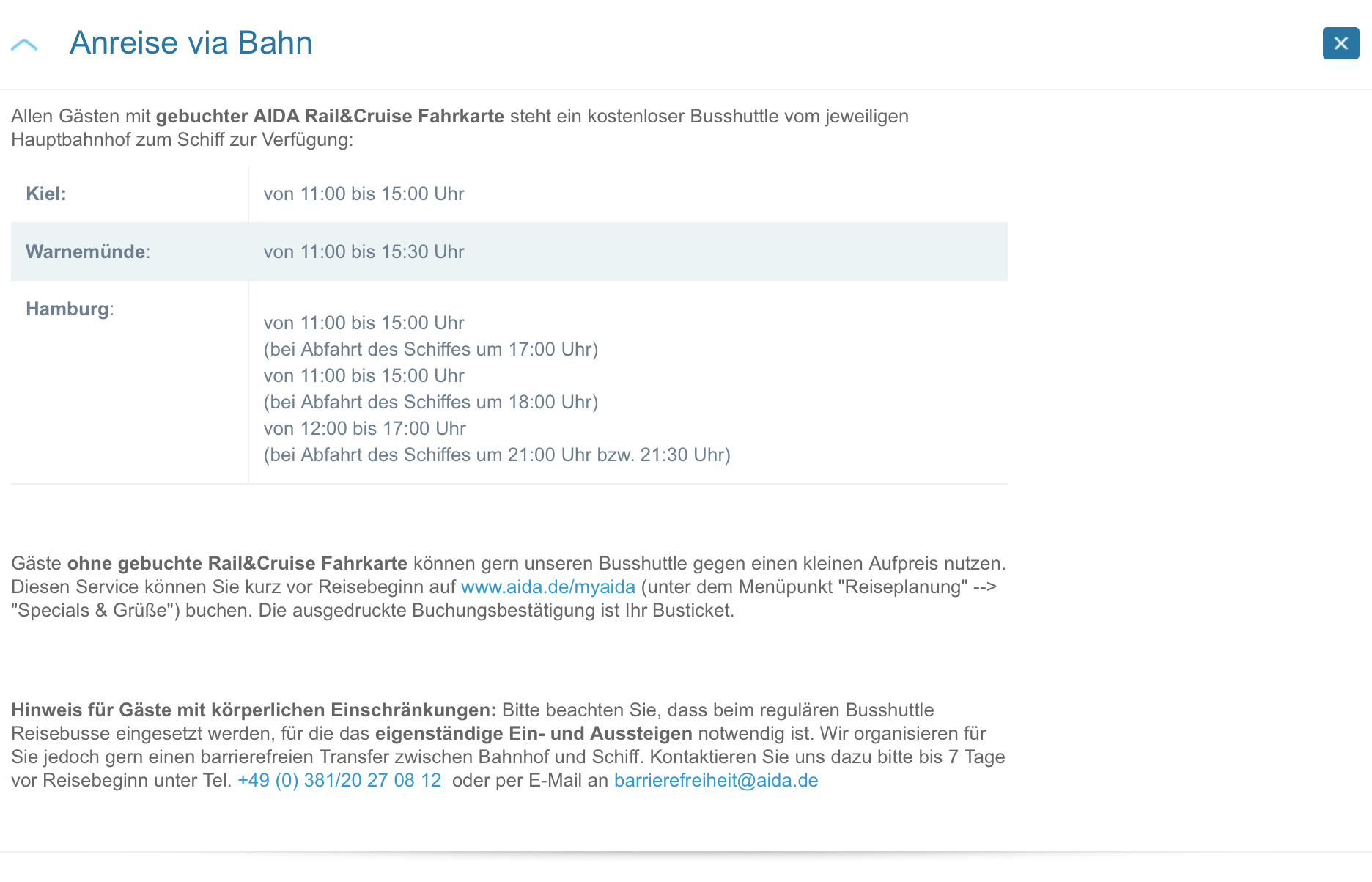 Das AIDA Bus-Shuttle ab HH Hbf ist kostenfei enthalten, wenn ihr das „AIDA Rail & Cruise“-Ticket habt. Ohne dieses Ticket könnt ihr das Shuttle mW nur via myAIDA buchen und bezahlen.