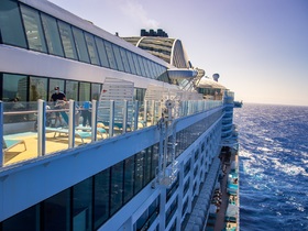 Oben gibt es die Panoramabalkonkabinen die noch Zugang zum Partiodeck haben und die haben offene Lamellen als Dach. Bei Regen wird’s auf dem Balkon nass. Aber das Problem hat auch das Partiodeck. Eher was für trockene und warme Fahrgebiete, dafür aber dann super