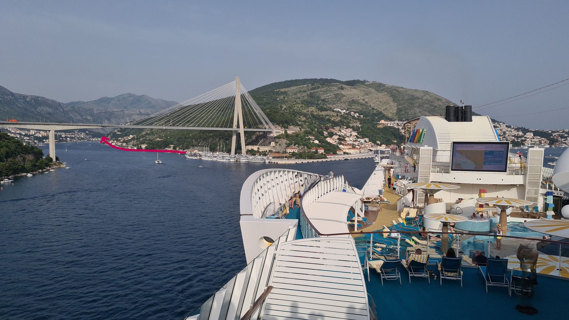 Dann geht es rauf auf die Franja-Tudman-Brücke. Von dort hat man eine tolle Aussicht Richtung Schiff und Dubrovnik.