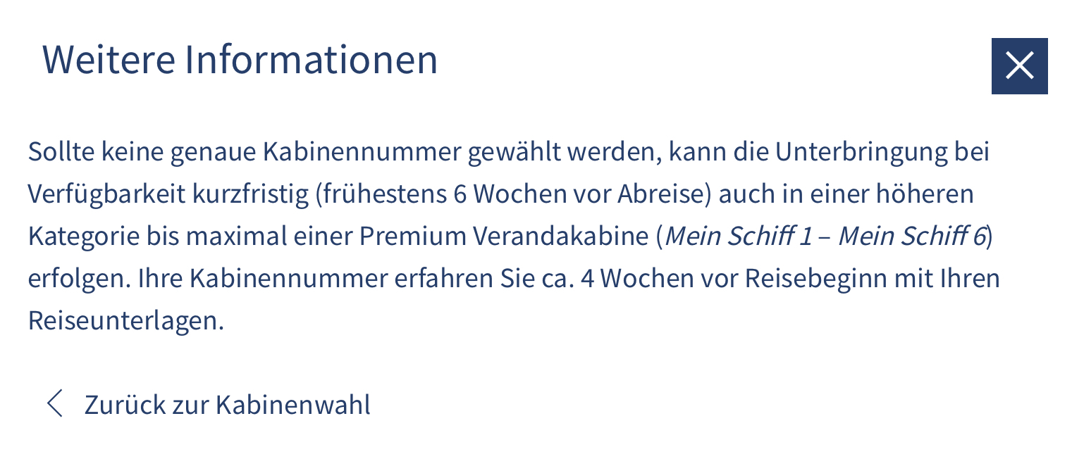 Und schließlich die Fragen, wo steht das Bett, Raucherbalkon ja oder nein und bei einer Trans Backbord oder Steuerbord.