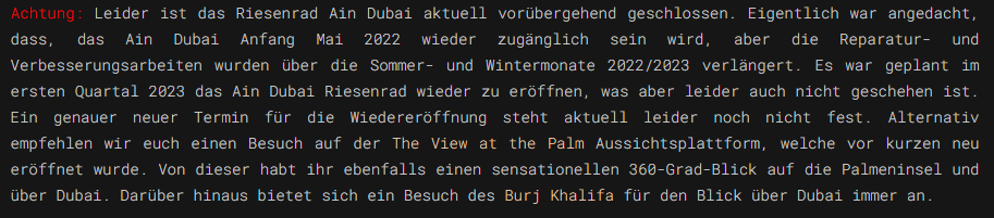 Für mich auch ein absoluter Traum-Liegeplatz, die Skyline einfach nur der Hammer (siehe Foto, das Foto fängt das aber leider nur zum Teil ein). Das Riesenrad (AIN Dubai) passt ganz weit rechts nicht mehr ins Bild. Die Frage ist auch, was damit wird. Es gibt anscheinend zwei Theorien: Die eine besagt, dass es ein Getriebeschaden wäre, die andere, dass das Fundament absackt und das Rad sogar ganz demontiert werden müsste. Also Ausflüge mit Riesenrad bloß nicht buchen! Hatten wir zum Glück auch nicht getan, weil ich schon gelesen hatte, dass es länger ausfällt. Bei unserer Hop-on Hop-off Tour hat man auch Flex-Arbeiten an der Achse gehört. Der Bereich war auch zum Teil verkleidet. Das macht evtl. Hoffnung auf eine Reparatur. Aber dafür würde ich keine Hand ins Feuer legen.