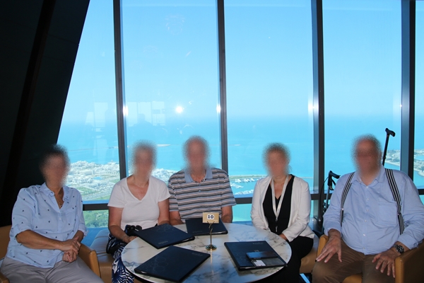 Wir waren im April 2019 auch auch dem Observation Deck at 300 zwischen 12:30 und 13:30 Uhr Ortszeit. Es war im gesamten Etihad Tower recht wenig los, im 300er Restaurant fast nichts.