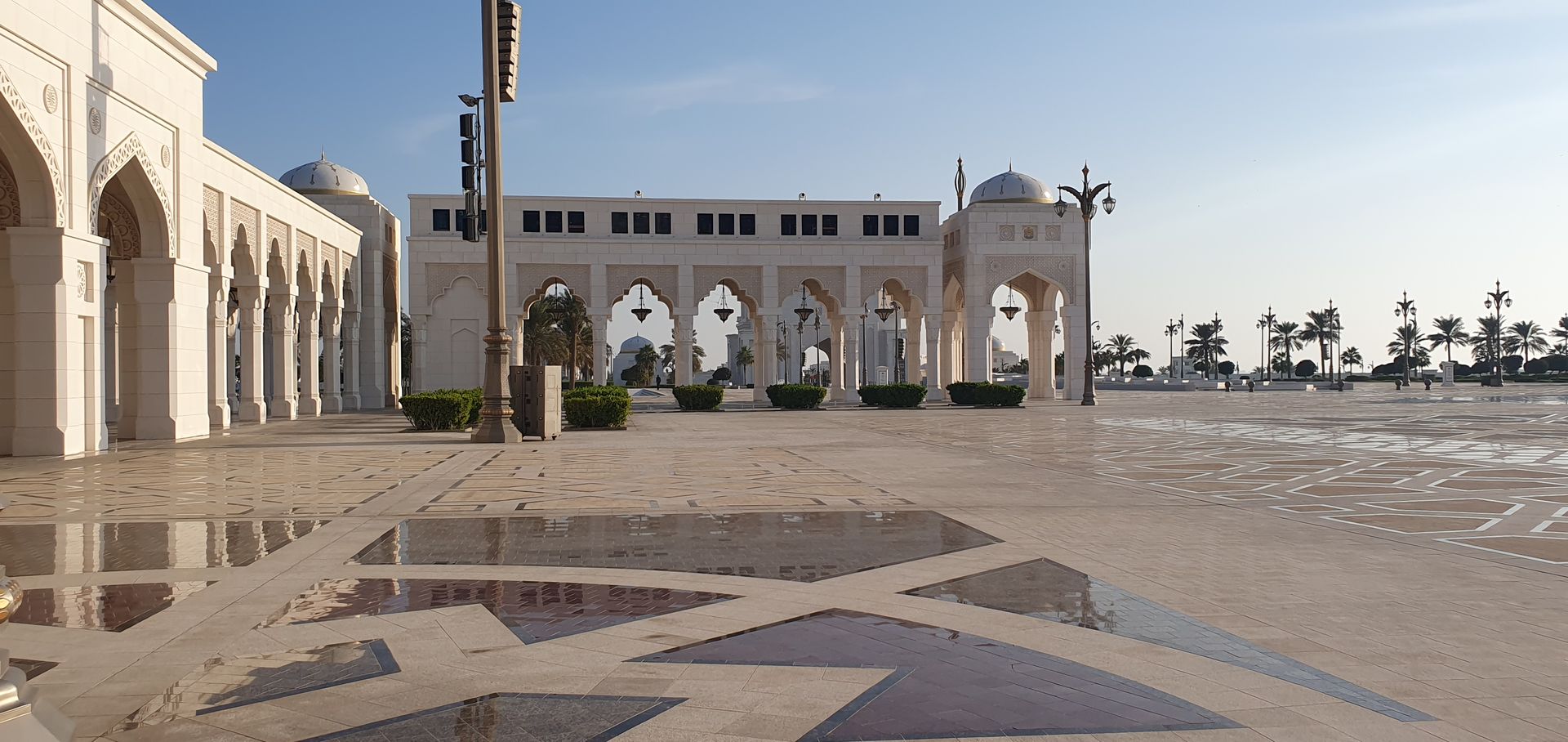 Im Anschluss sind wir beim Emirates Palace auf der Straße nach rechts gelaufen (ca. 2,0 km) zum Qasr Al Watan – Abu Dhabis prunkvoller Präsidentenpalast. (Taxis wären bereitgestanden aber wir laufen auch immer wieder gern ein Stück).