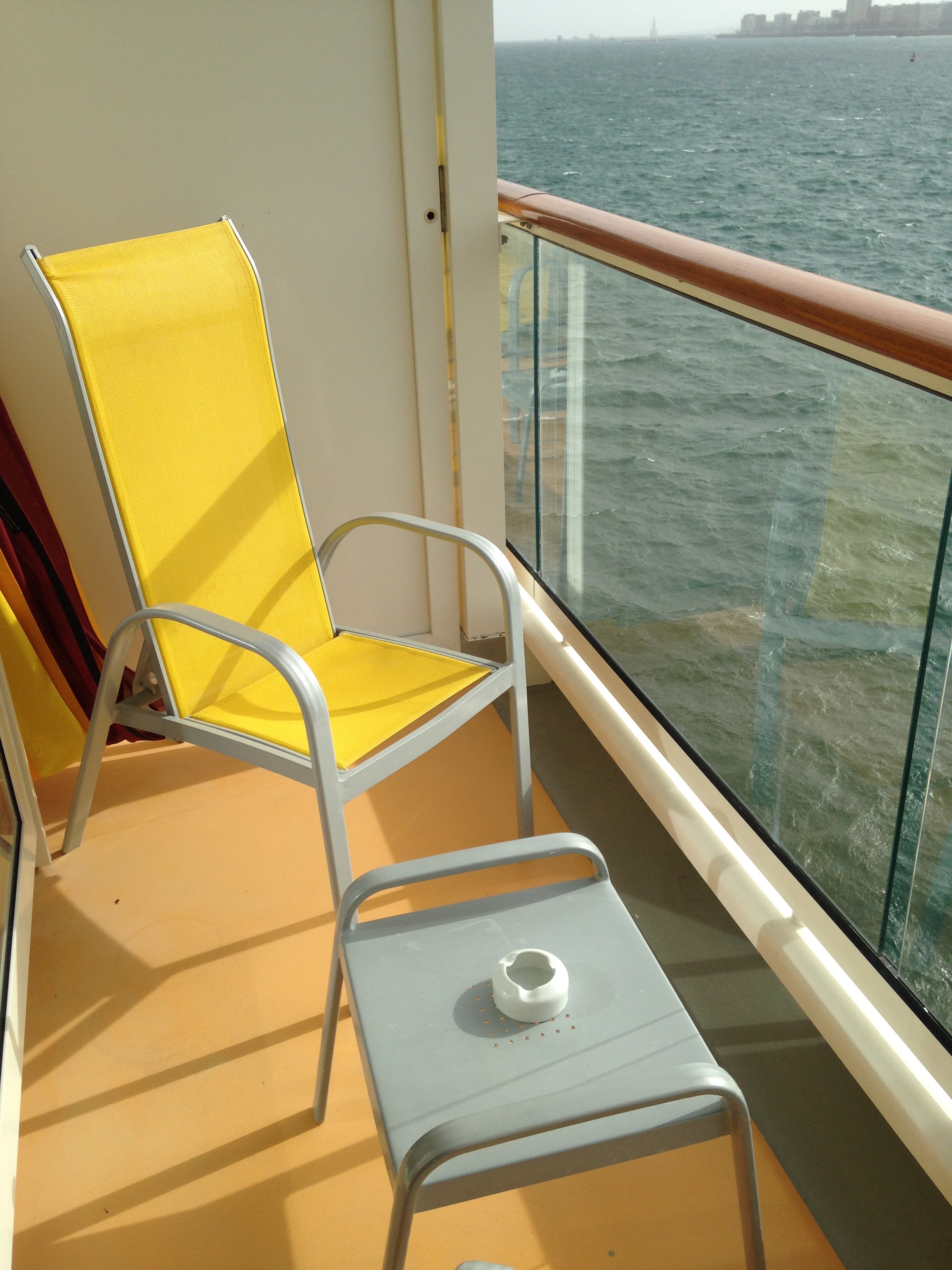 Diese Balkonkabine (BA) liegt mittig steuerbord. Doppelbetten entgegen der Fahrtrichtung.