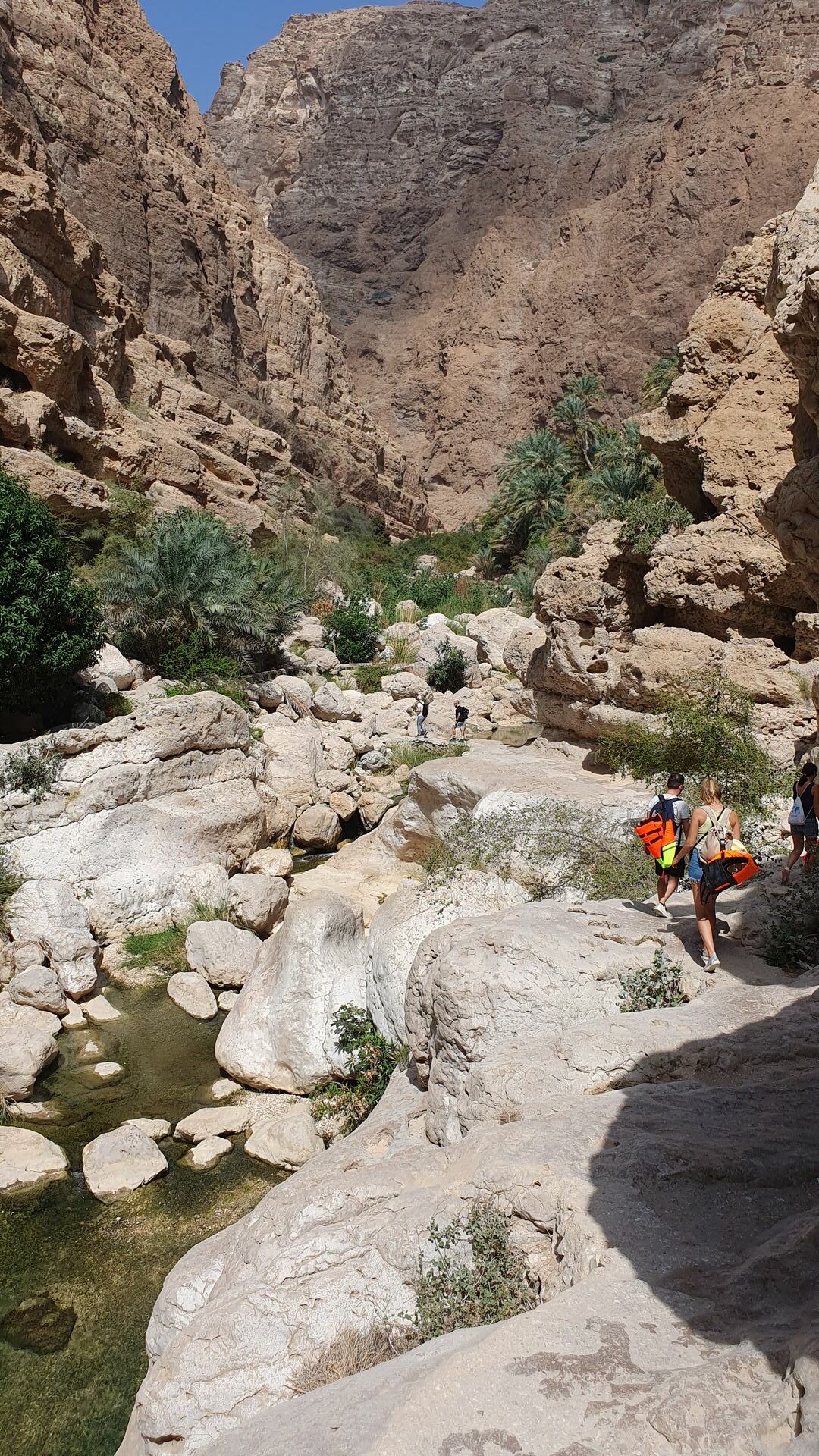 Anschließend begann die Wanderung durch die beeindruckend, schöne karge Felslandschaft des Oman, wo jedoch alle paar Meter grüne Oasen hervortraten und der türkisblaue Fluss Wadi Shab zwischen den Felsen hervorglitzerte.