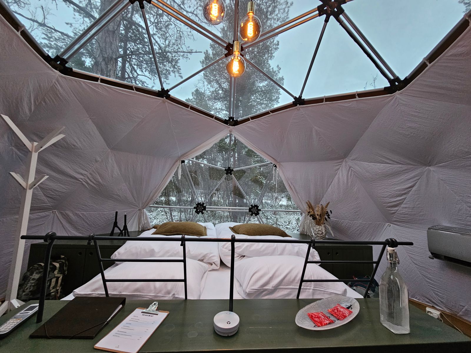 Wir bekamen den Dome mit der Nummer 5. Es war wirklich traumhaft. Innen ist es wirklich warm. Hier braucht keiner zu frieren. Außerdem gibt es auch einen Holzofen, wenn man es wirklich richtig heiß möchte. WC und Waschbecken sind vorhanden. Wer duschen möchte, muss ins Haupthaus gehen. Das ist aber nur ein kurzer Fußmarsch von nicht einer Minute. Sauna gibt es auch, muss aber angemeldet werden und kostet extra (glaube 20 NOK). Man wäre dort aber alleine. Es gibt auch die Möglichkeit dort zu Abend zu essen (wir bekamen leckere Fischsuppe mit Brot. Kostenpunkt für 2 Personen 500 NOK). In Laufnähe ist ebenfalls die Holmen Husky Lodge sowie das Restaurant: Sami Siida Alta. Leider hatte es an dem Tag zu, sonst wären wir mal vorbei gegangen. Die Gegend ist wirklich wunderschön. Es gibt auch die Möglichkeit sich ein Fatbike auszuleihen oder auch an einer Nordlichtjagd teilzunehmen. Im Dome selbst gibt es ein kleines Büchlein, in dem auch Wanderwege enthalten sind. Die Fahrtzeit zum Hafen beträgt ca. 15 Minuten. Es war wirklich super, super schön da