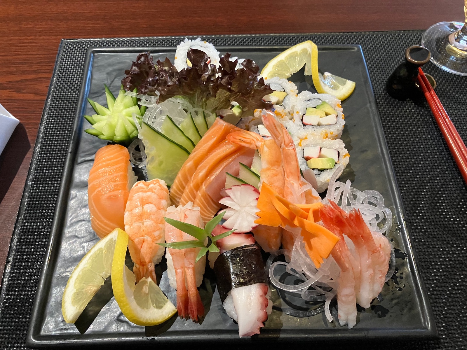 Es gibt auf der Karte auch einen gemischte Sushi-Teller für eine Person, der ich meine 19,95€ kostet. Da wird man gefragt, ob man den selbst zusammenstellen möchte oder der Koch aussuchen soll. Das ist von der Menge her auf jeden Fall angemessener, habe ich trotz Vorspeise zweimal locker geschafft: