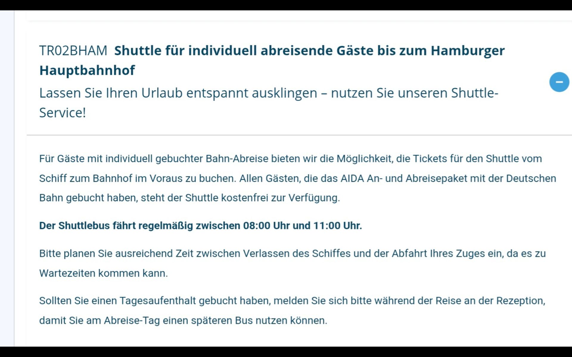 Hm, ich habe mich auch nicht zur Ankunftszeit am Hbf geäußert, sondern auf die Frage geantwortet, ab wann die Shuttlebusse in Steinwerder am Abreisetag abfahren.