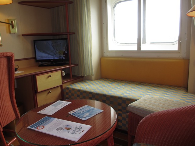 Die Kabine hat ein großes Fenster (mit zu öffnendem "Innenfenster"), davor eine Bettcouch, die allerdings etwas kürzer als die herkömmlichen Betten ist.