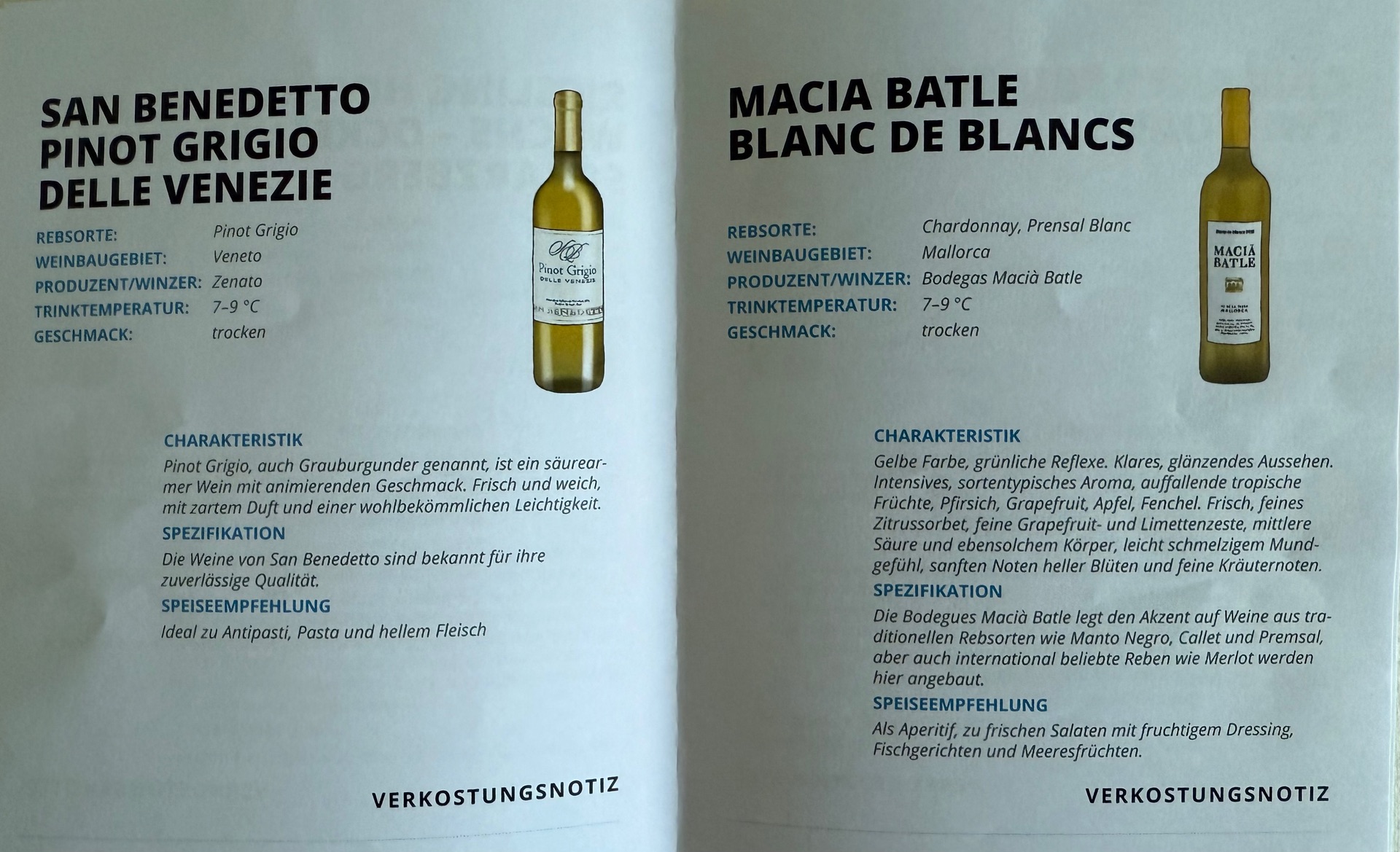 Das entspricht exakt der (beispielhaften?) Auswahl der unter myAIDA gelisteten Weine für eine Weinprobe sowohl für unsere Perla Tour 07/25 und auch für die Mar 01/26.