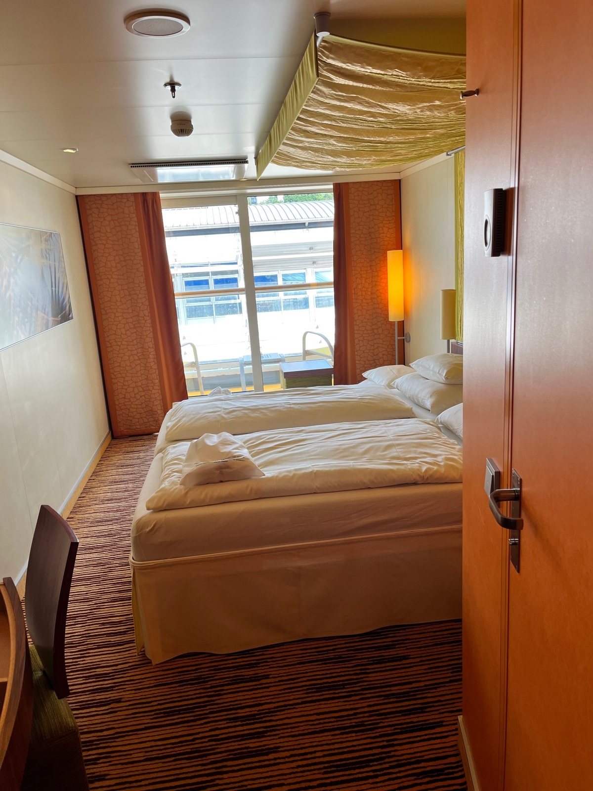 Die Balkonkabine befindet sich auf Deck 9 ziemlich weit vorne im Schiff. Die Betten stehen zusammen mit dem Kopfende in Fahrtrichtung. Unter dem Betten sind zwei Kisten für einen dritten Gast. Wir haben die Kabine zu zweit bewohnt. Unsere beiden mittelgrossen Koffer hatten noch Platz unter dem Bett und wir konnten unsere Kleider bequem in den drei Schränken verstauen. Alles in allem waren wir von der über Vario zugewiesenen Kabine begeistert. Die Kabine war sehr leise, von der darüberliegenden AIDA Bar war nichts zu hören.