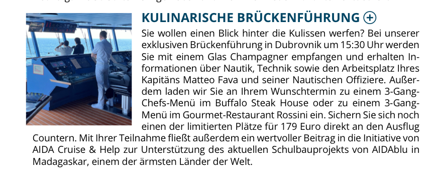Die kulinarische Brückenführung wurde nur im Rahmen einer Prime Time erwähnt (ohne den Preis zu nennen), aber nicht in der AIDAheute. Dass es drei Termine waren, hatte ich dann beim club@sea-Event mitbekommen. -