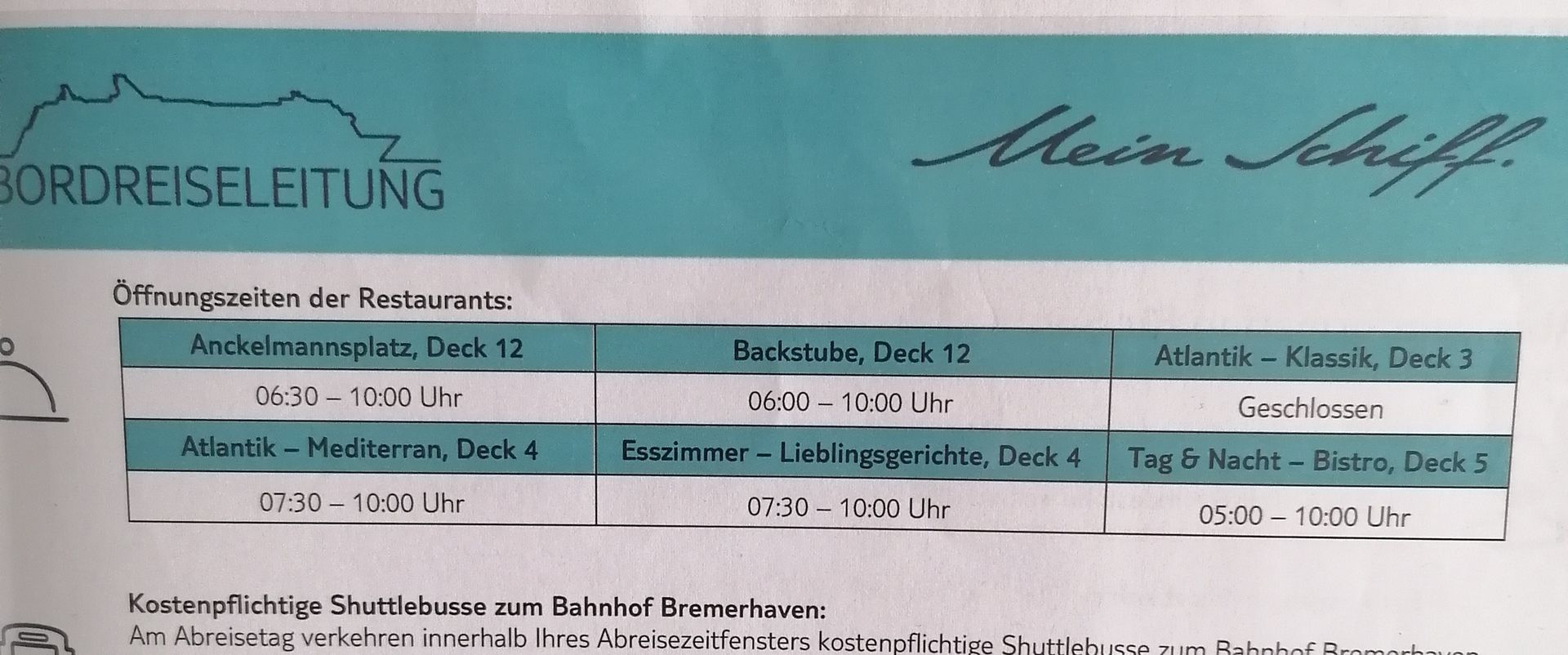 Um 10 Uhr beenden alle Restaurants das Frühstück. Ab 11 Uhr geht´s wieder weiter...