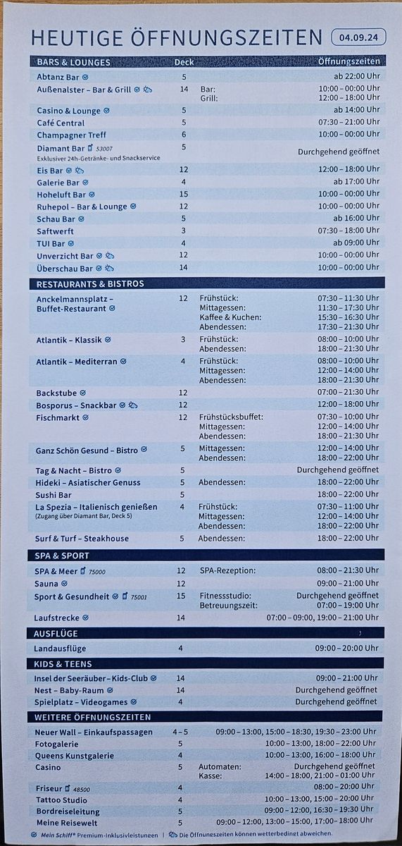 Ich empfehle auf Youtube den Schiffrundgang von M. M. Wir waren im Juni auf der MS 7, es gibt quasi 24/7 immer irgendwo etwas zu essen. Das Schiff ist nicht wesentlich anders, das wäre die neue Relax, die größer ist und auch vom Konzept etwas von den anderen der Flotte abweicht.