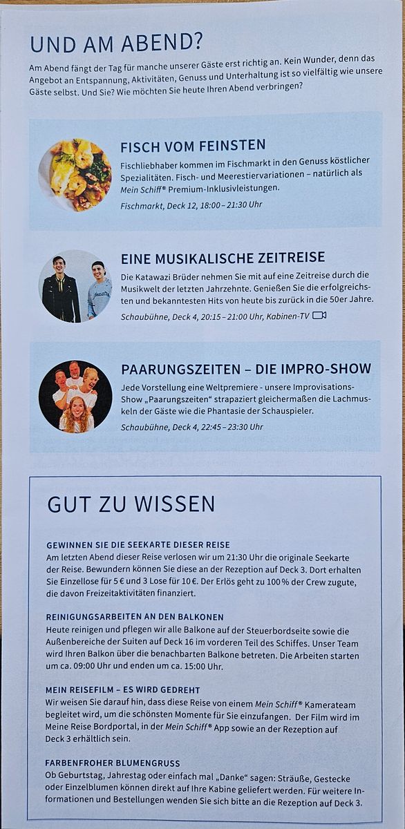 Besonders interessant fand ich die Seite mit den Öffnungszeiten und das aufgelistete Abendprogramm. Das Kabarett dabei ist, find ich gut. Hab ich bei AIDA noch nicht gesehen. :)