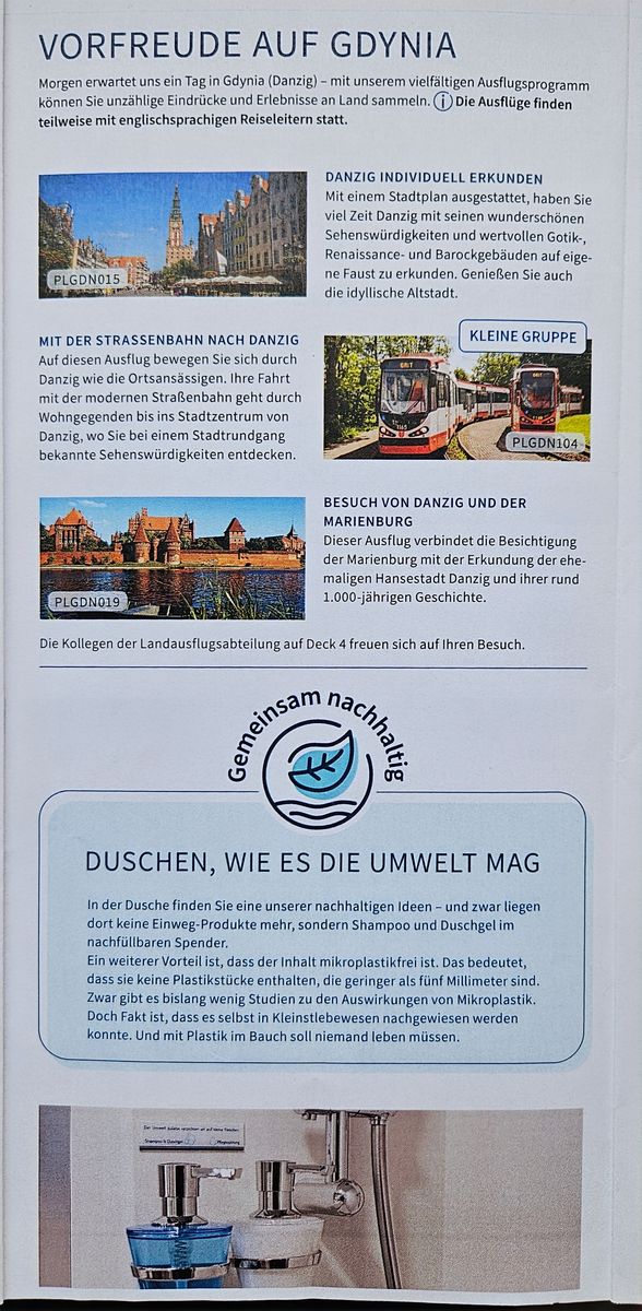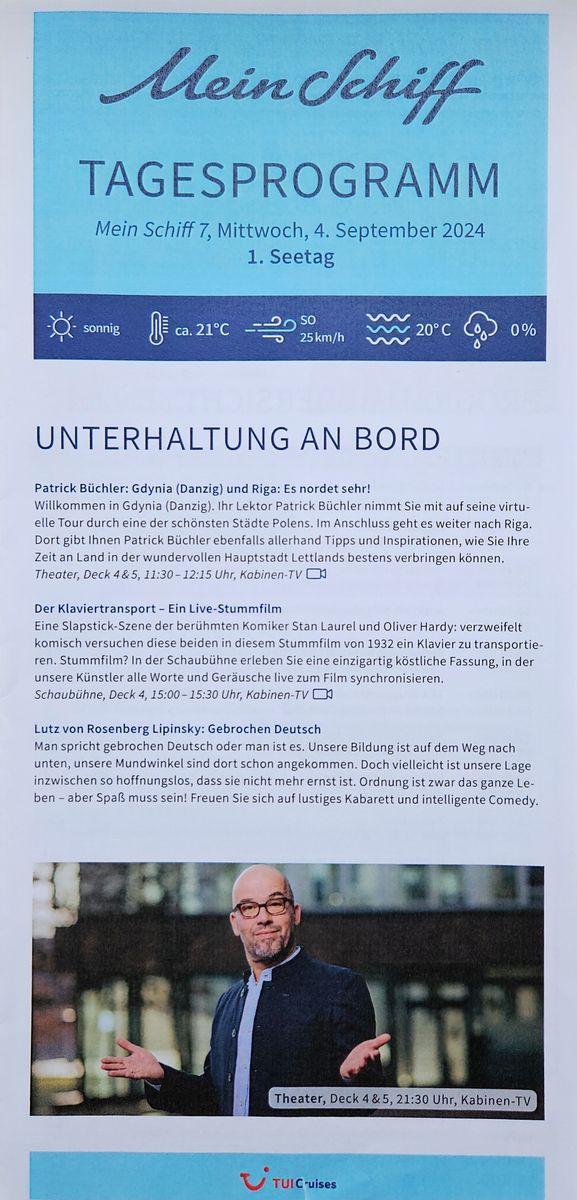 Ich stelle das mal hier rein. Meine gemachte Reise ist allerdings anders gewesen als üblich. Wir sind direkt ohne Seetag nach Kopenhagen gefahren. An diesem Tag war das Programm dadurch noch 'dünn'. Der Seetag war erst am nächsten Tag und dann halt auch erst das Alleinreisendentreffen und das ausführliche Programm über den Tag verteilt. Musste gucken. Ist unsortiert