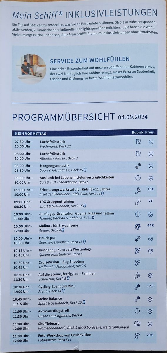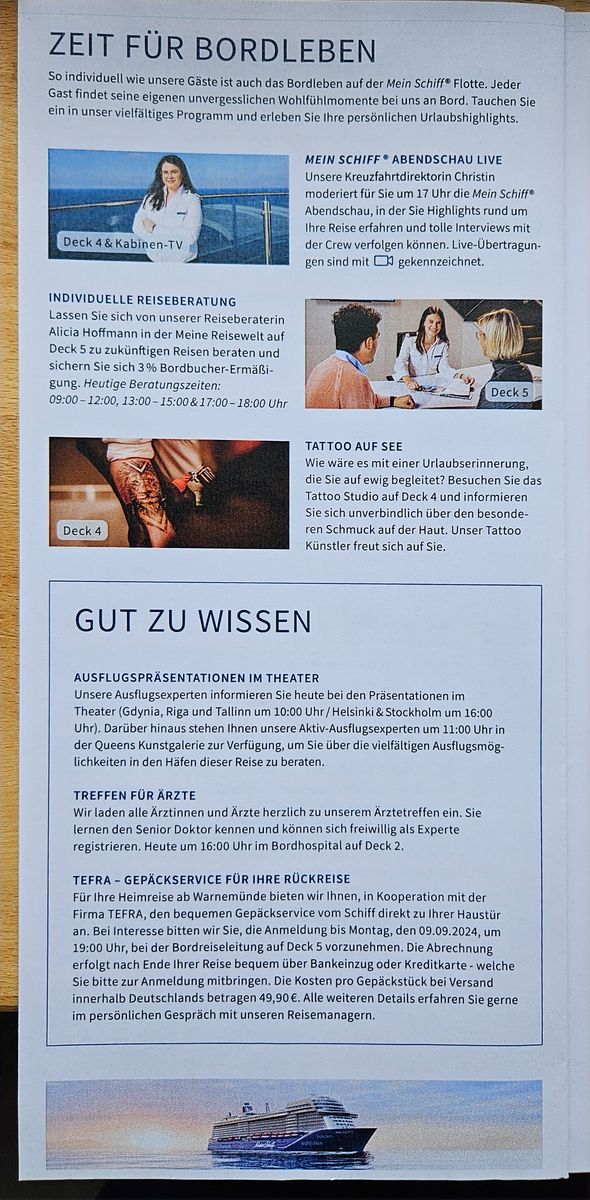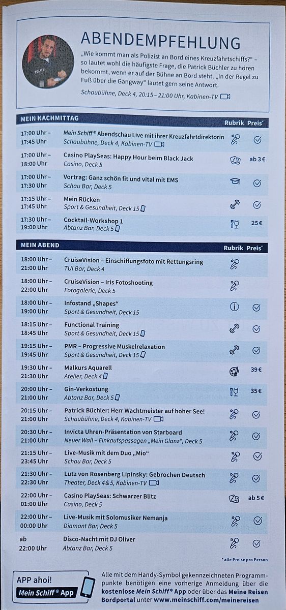 Soll ich Dir mal Tagesprogramme hier zur Verfügung stellen? Ich hätte welche aus 09/24 von der 7. Aber auch von anderen Schiffen.