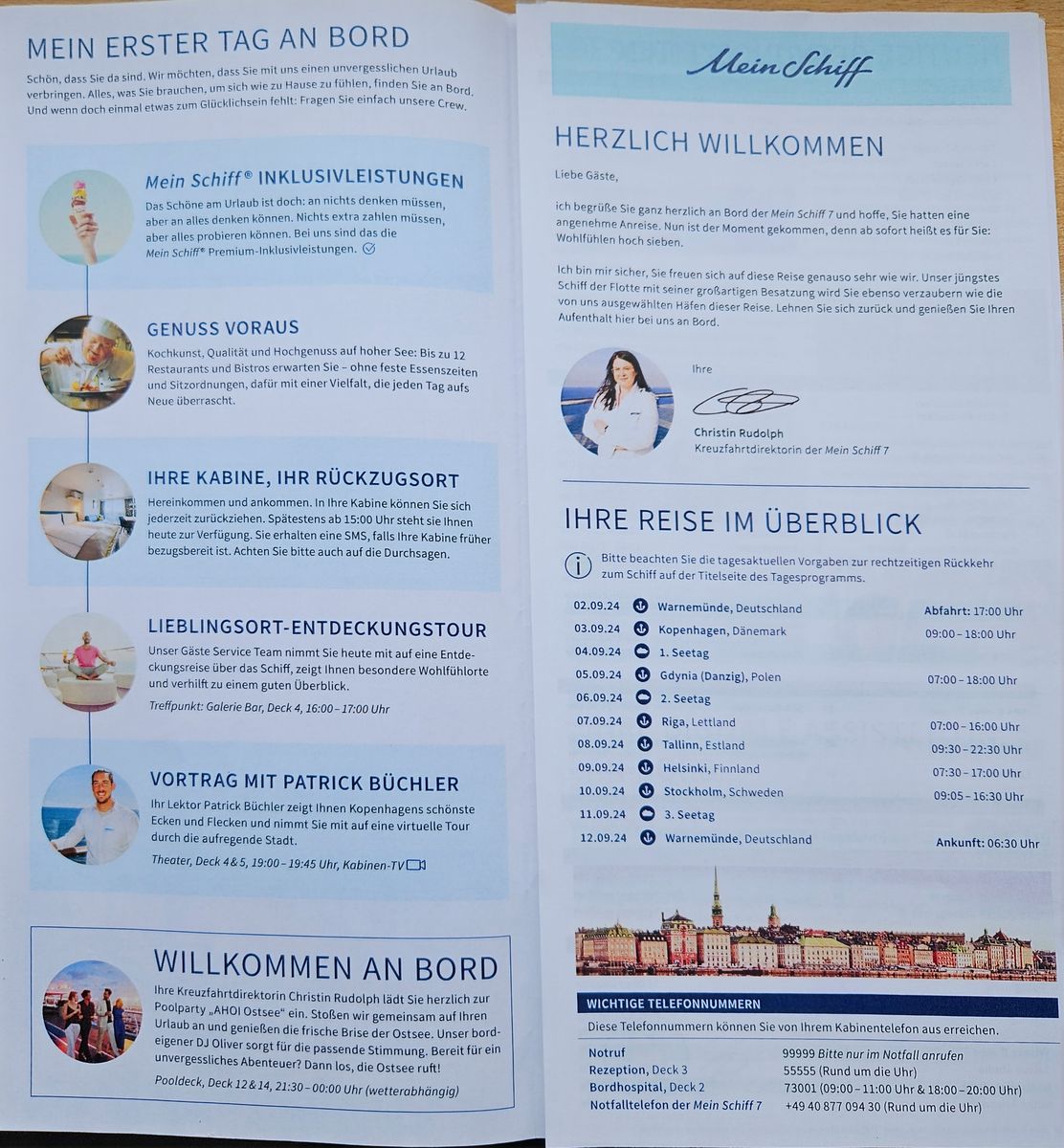 Ich stelle das mal hier rein. Meine gemachte Reise ist allerdings anders gewesen als üblich. Wir sind direkt ohne Seetag nach Kopenhagen gefahren. An diesem Tag war das Programm dadurch noch 'dünn'. Der Seetag war erst am nächsten Tag und dann halt auch erst das Alleinreisendentreffen und das ausführliche Programm über den Tag verteilt. Musste gucken. Ist unsortiert