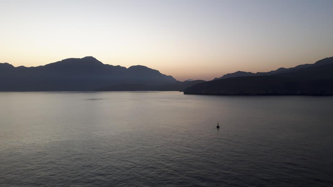 Eigentlich hatten wir vor, mit AIDA einen Ausflug ins Gebirge zu machen und als wir uns endgültig entschieden hatten, war der Ausflug ausgebucht. Würde ich mal als „Wer zu spät kommt, hat das Nachsehen“ abhaken. Am Abend vorher haben wir mit einem netten Ehepaar ausgemacht, wir gehen einfach im Hafen von Bord und dann schauen wir mal. Auf jeden Fall wollten wir nicht mit dem Shuttle-Bus ins Stadtzentrum fahren, vielmehr interessierte uns die bizarre Landschaft. Kurz vor der Abreise hat unser AIDAfreund Ottmar von einer Fahrt mit einer Dhau durch die Fjorde erzählt. Atemberaubende Landschaft sei da zu sehen. Allerdings hatte er leider etwas Pech gehabt – seine Tour startete bei schönem Wetter und dann kam Sturm auf. War dann wohl es etwas heikel geworden mit der Rückfahrt, aber das Boot kam noch gut im Hafen an und die Stella lag nicht mehr im Hafen. Sie wurde in Sicherheit gebracht auf See und die Passagiere kamen mit Tenderbooten zur Stella zurückgefahren. Oh, ein wenig abgeschweift vom Thema. Nö, das möchte ich nicht so erleben und habe deshalb die letzten Tage genau auf die Wetterprognosen unseres Kapitän geachtet. Die Aussichten auf eine sturmfreie Fahrt durch die Fjorde stehen gut! Der Morgen ist leicht diesig, windstill ...