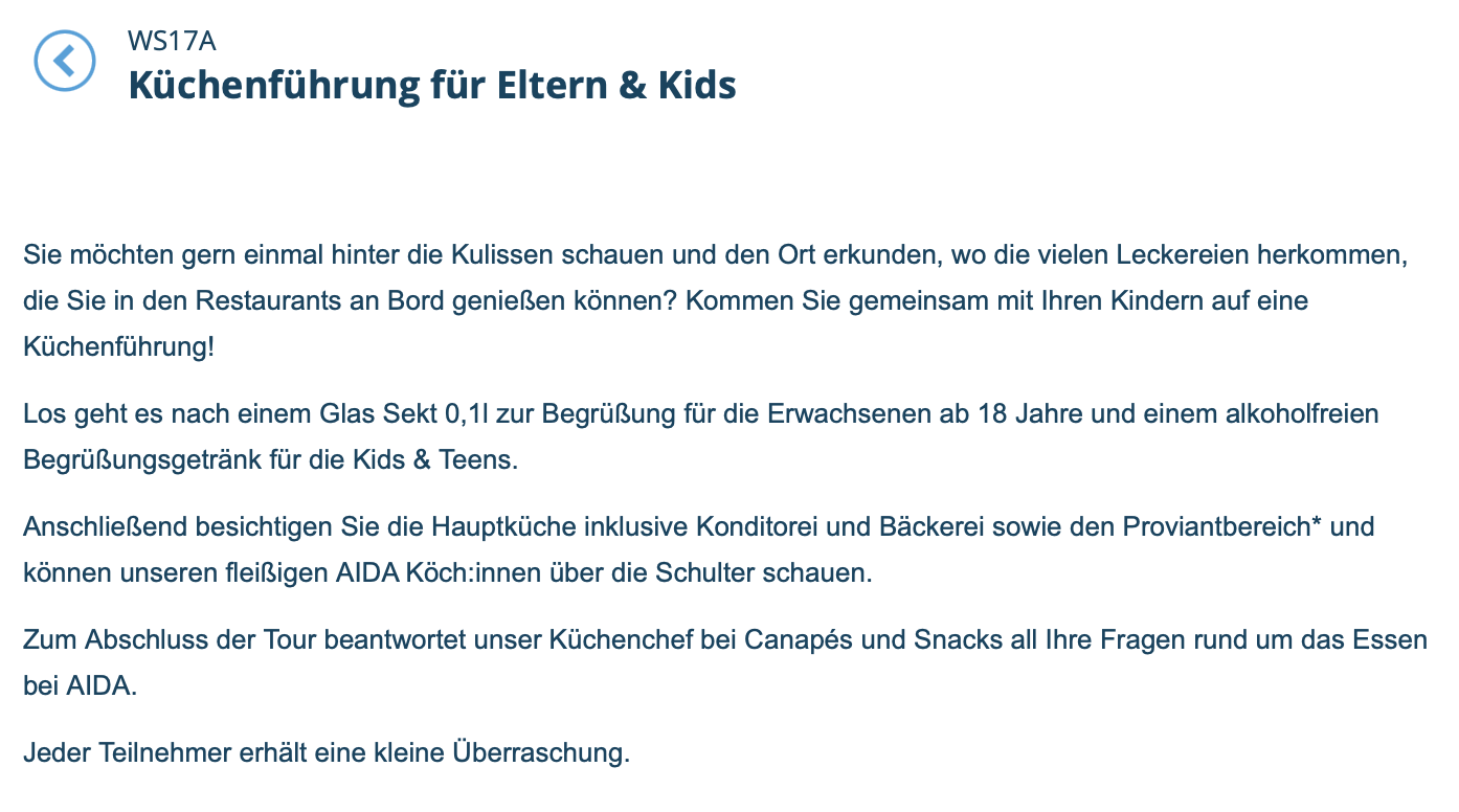 Mein damals 12jähriger durfte im Februar 2023 mit zur Küchenführung. Das kann man nur nicht im Vorfeld über myAida buchen. Sondern man fragt das auf dem Schiff an der Rezi oder noch besser Activity-point.