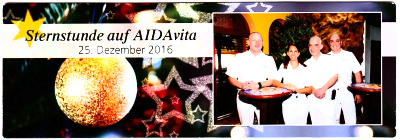 Das war für uns mit Abstand die schlechteste von bisher 5 Sternstunden.... das zu Silvester das Rossini und evtl. auch das BSH ausgebucht sind, wusste AC mit Gewissheit auch schon früher. Warum wurde die Sternstunde nicht vor oder nach Silvester verlegt ? Das ist die Frage. Das sieht nach lästiger Pflichterfüllung aus. Essen im stehen ??? Auf so eine Sternstunde könnte ich verzichten. !!!! Das es auch anders geht haben wir auf der Weihnachtstour 2016 auf der Aura erlebt. Diese Sternstunde hat ihren Namen verdient. Silvia Fürst hat sich wirklich was einfallen lassen. Wer mehr darüber erfahren möchte, kann das im Beitrag 957 vom 2. Jan17 nachlesen.