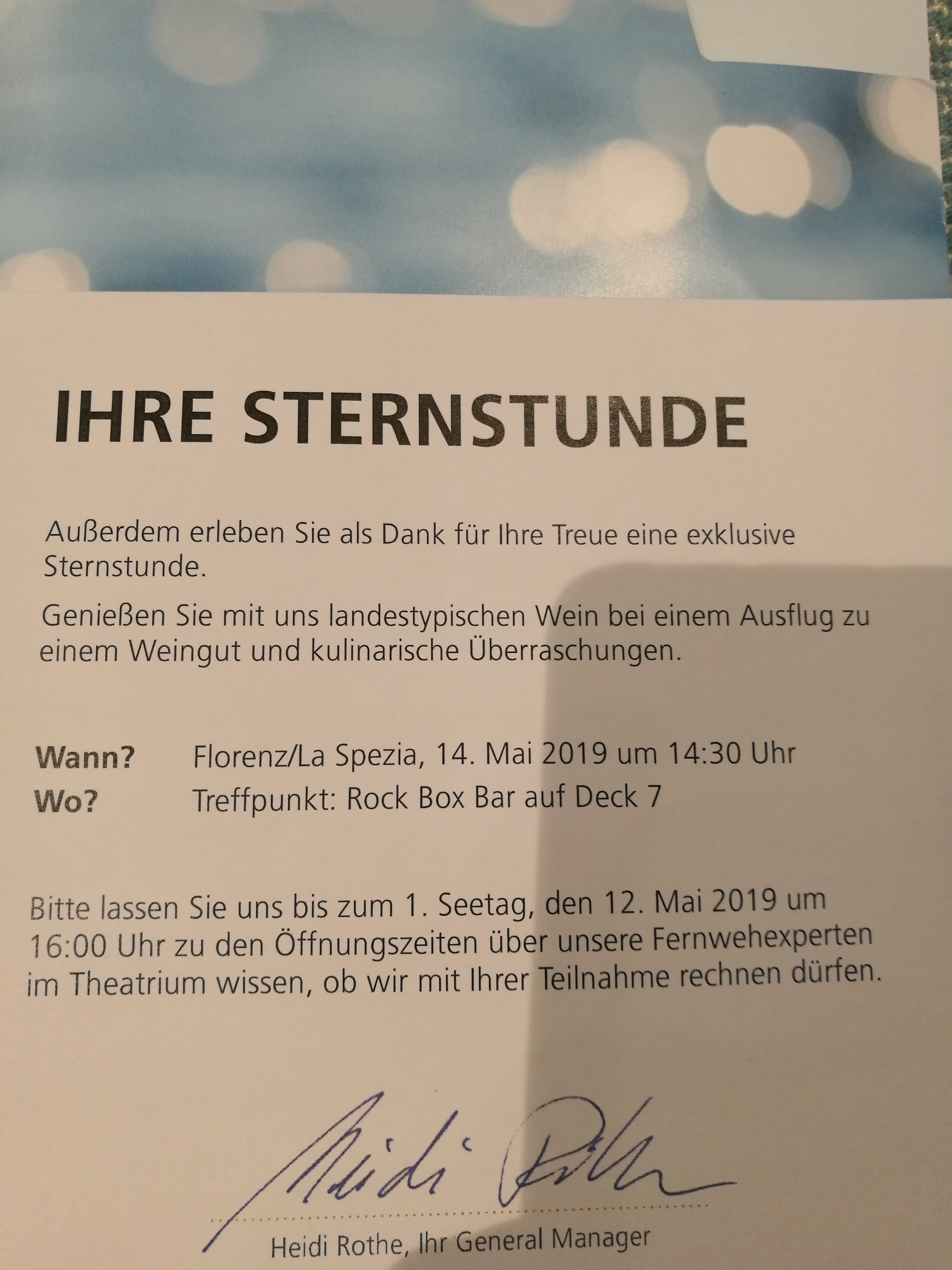Ist bei uns nicht anders, jedoch finde ich es einfach nicht gut, dass wenn der GM , auch wenn er kurzfristig was anderes vor hatte, nicht dann zumindest seinen Vertreter oder die Reiseberaterin, die so oder so alles koordiniert, vorbeischickt. Klar der ein oder andere will überhaupt niemand dabei haben, auch ok, aber ich frage mich dann nach dem Sinn einer Sternstunde. Ist es wirklich nur das kastenlose Essen und Trinken was man schön findet, oder auch die Gespräche mit den Offizieren, dei der man auch als Vielfahrer tolle Gespräche mit den Offizieren führen kann und dabei auch Informationen abzugreifen?