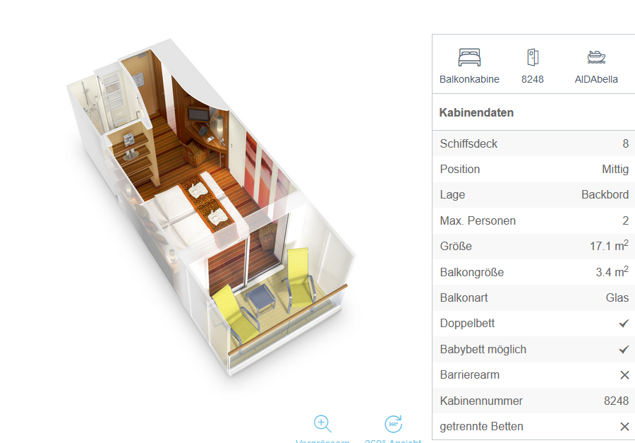 Bei den tatsächlich kleineren Balkonkabinen ohne Schlafsessel ist die Größe 14 m2.