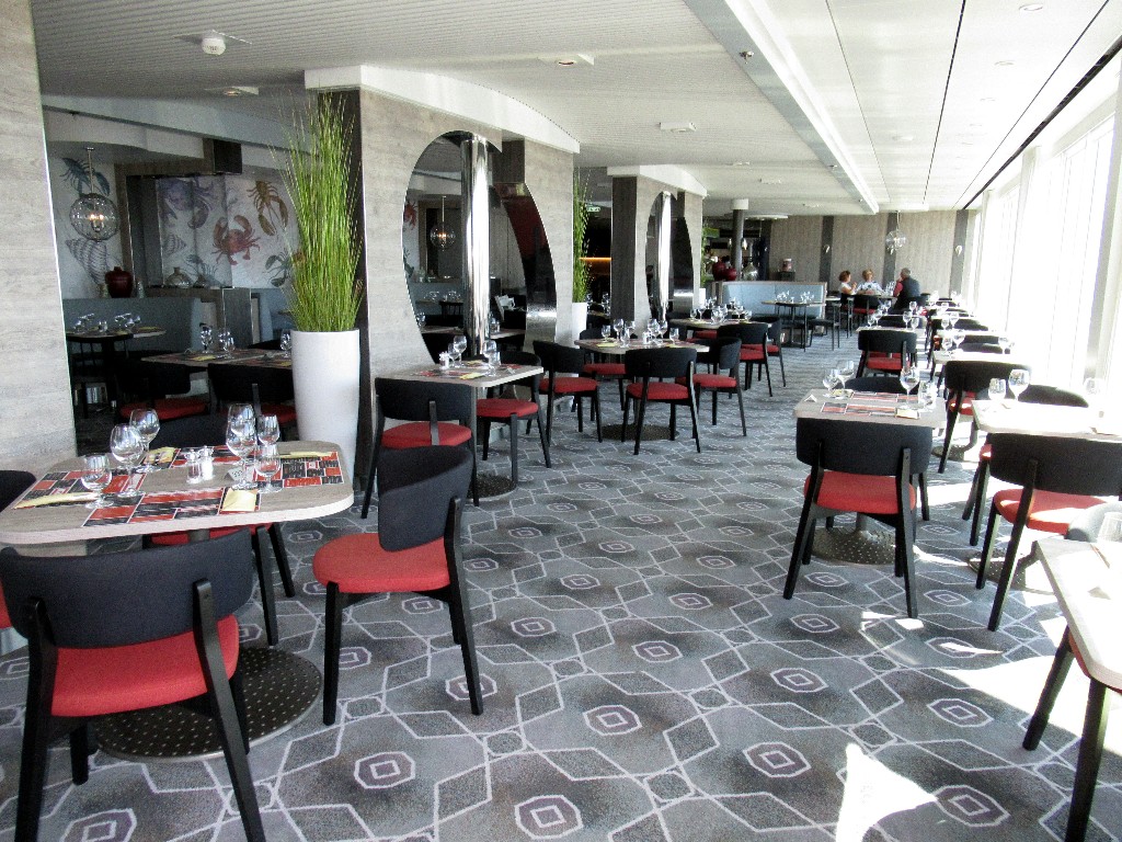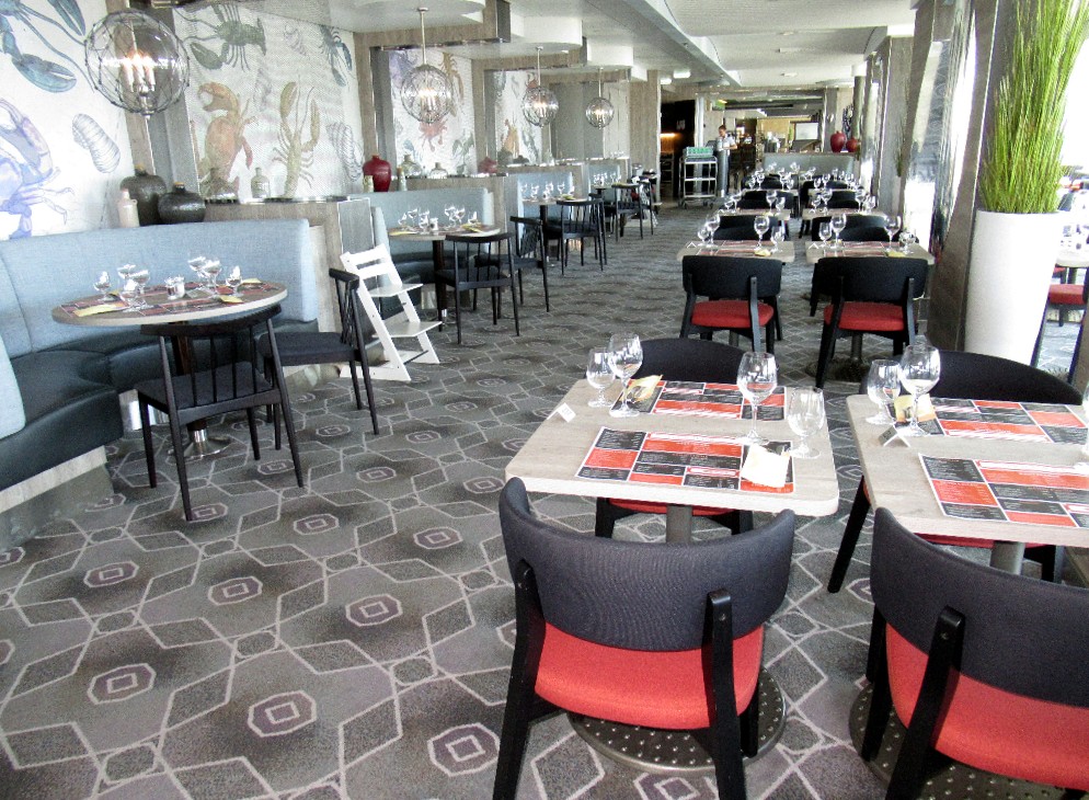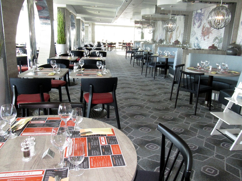 Die Innen-und Außenflächen im Fischmarkt Restaurant sind größer als bei den bisherigen Gosch-Restaurants in der MS 3 bis MS 6. Allerdings gibt es im Gegensatz zum Gosch kein Self-Service Buffet mehr. Der Fischmarkt auf der MS 1neu ist nur noch mit Bedienung. Bei Gosch gibt es ja bekanntlich 2 Varianten. Ein Teil ist Buffet Self-Service, ein weiterer Teil mit Bedienung.