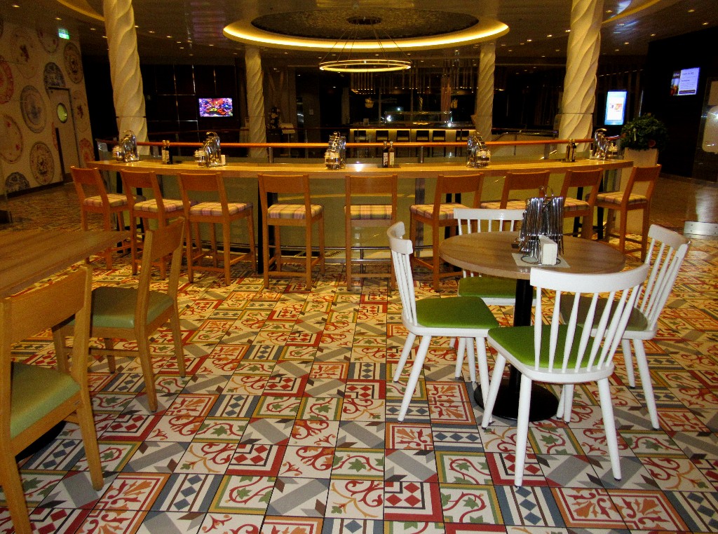Hier gibt es noch 2 Bilder von Sitzbereichen im Buffetrestaurant "Anckelmannsplatz" auf der "Mein Schiff 4"