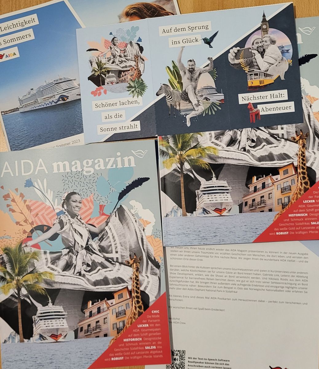 kannst ja das "AIDA-Magazin" z.B. auf dem Sonnendeck der "Mein Schiff" genauer anschauen